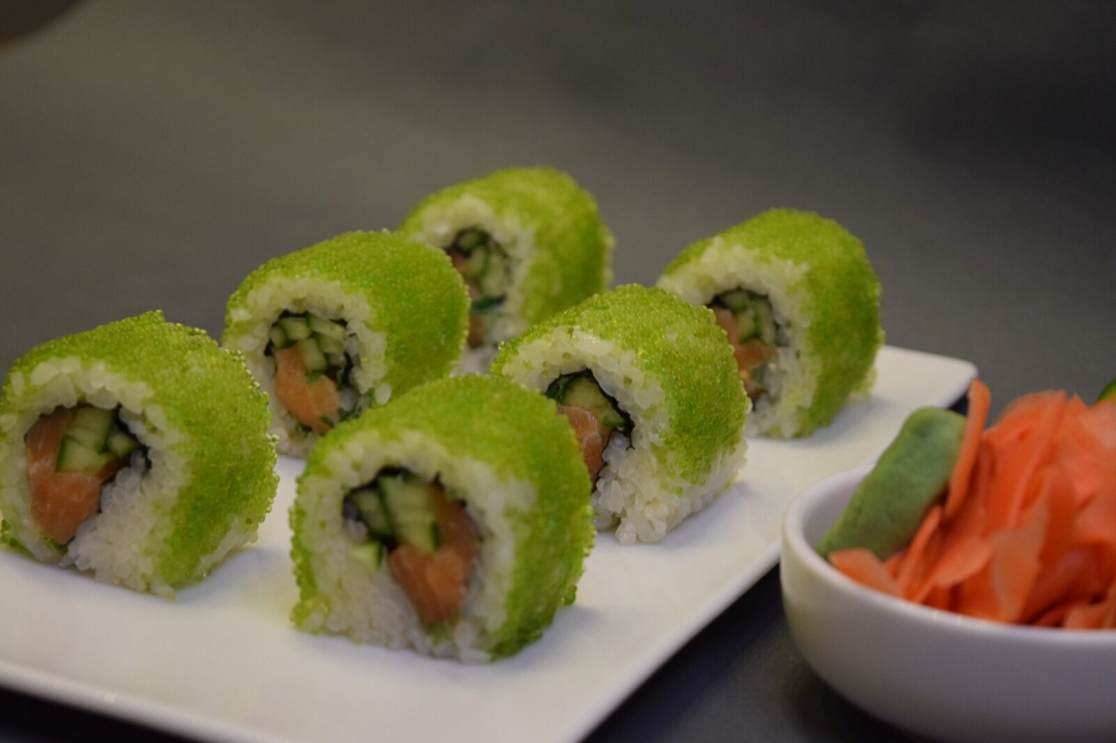 Rice, salmon, green onion, mayo, cucumber, green tobiko caviar.
