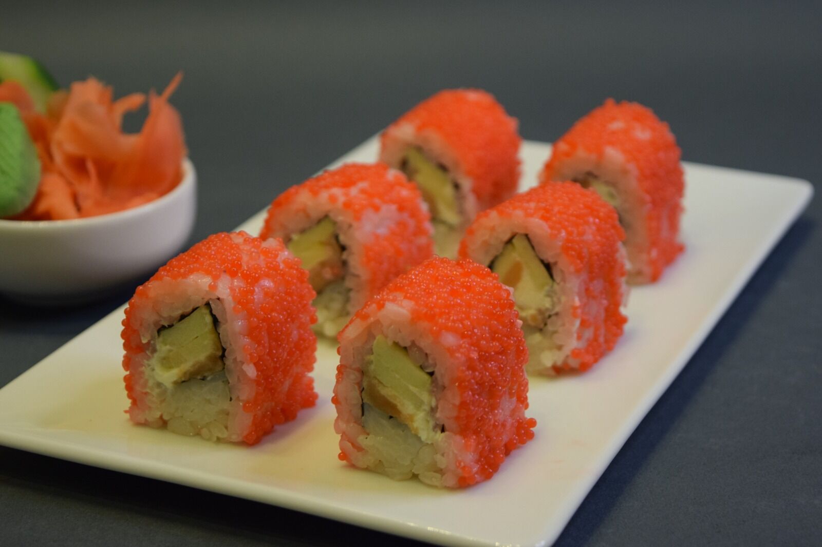 Rice, salmon, apple, cream cheese, red tobiko caviar.