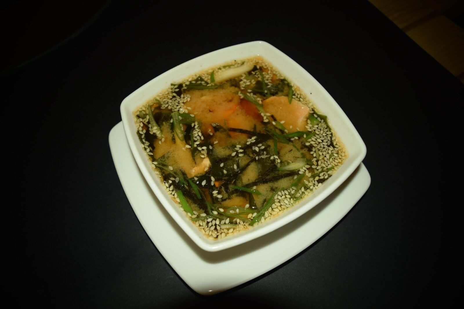 Miso, shrimps, octopus, mussels, salmon, squid, wakame, green onion, sesame, nori.