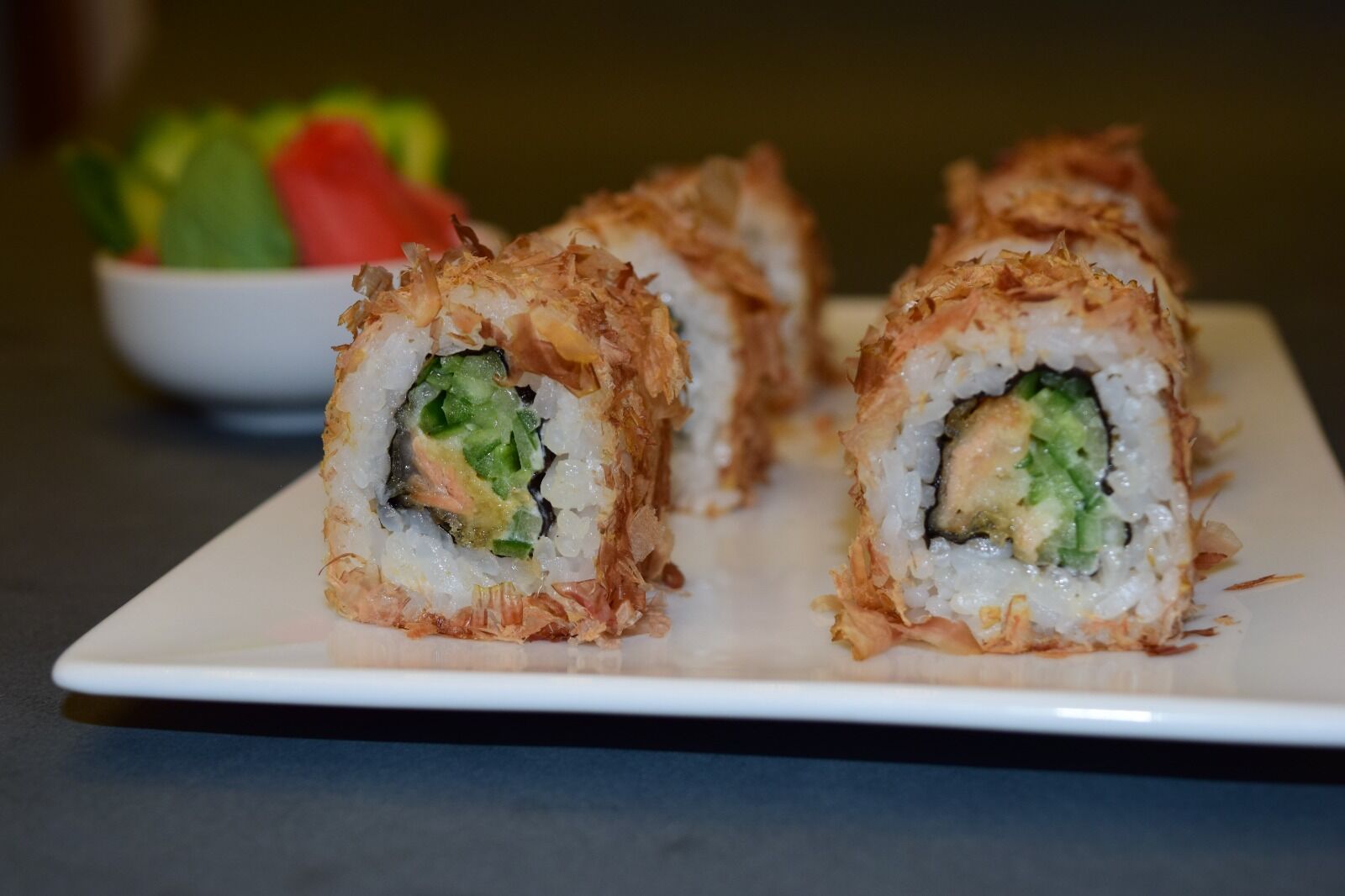 Rice, salmon tempura, spicy mayo, katsuobushi.