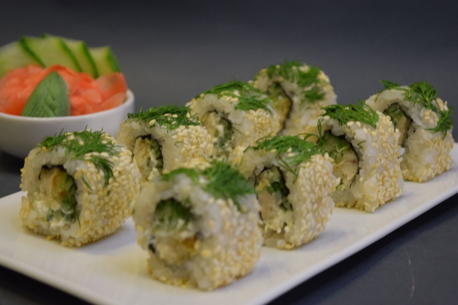 Rice, chicken tempura, cream cheese, dill, sesame seeds.